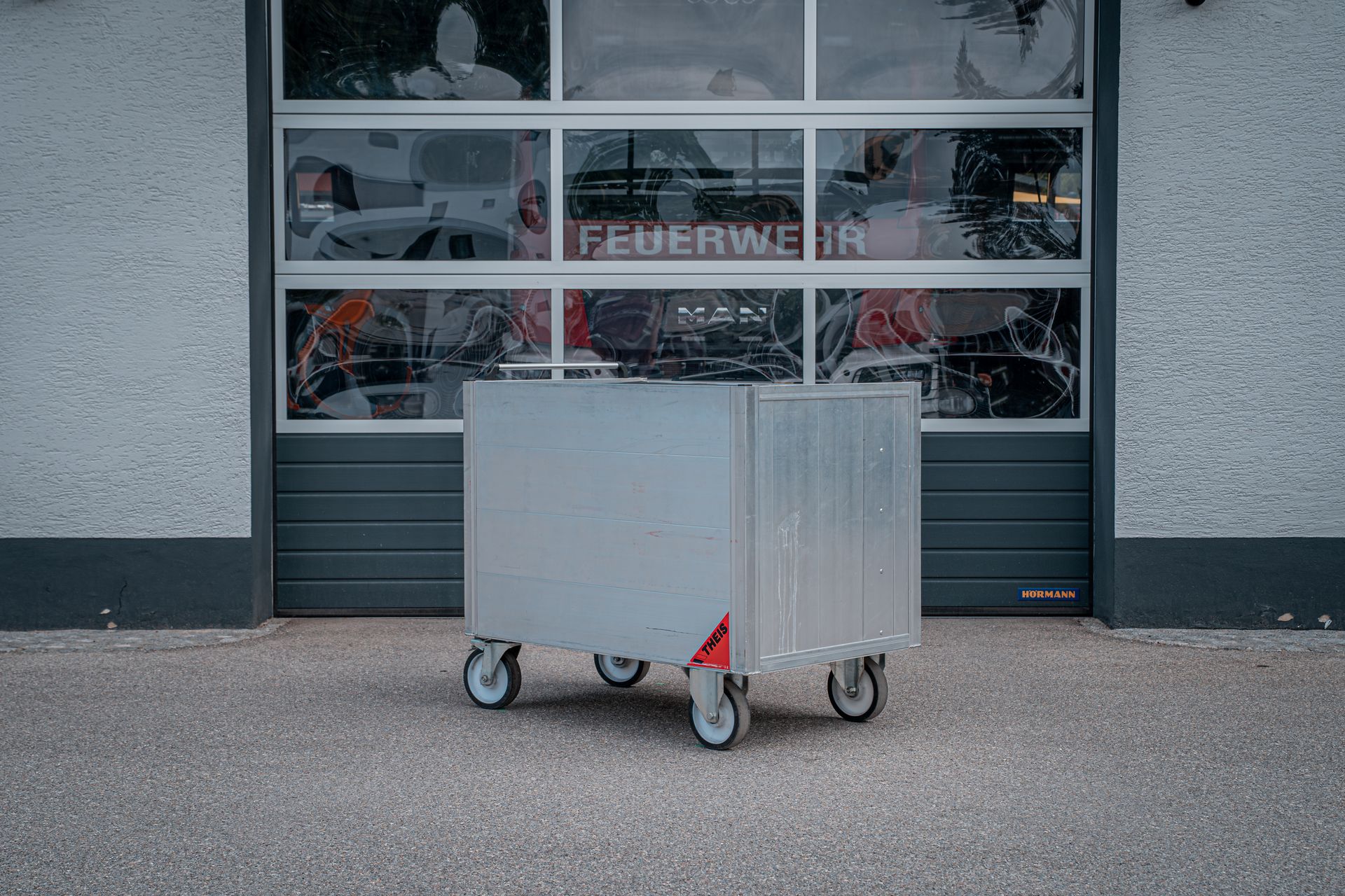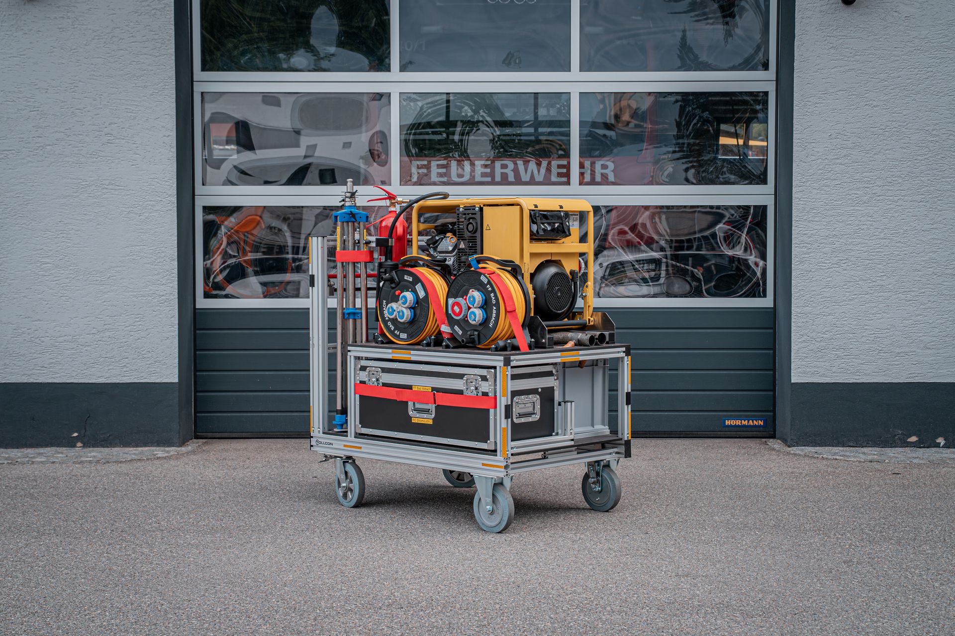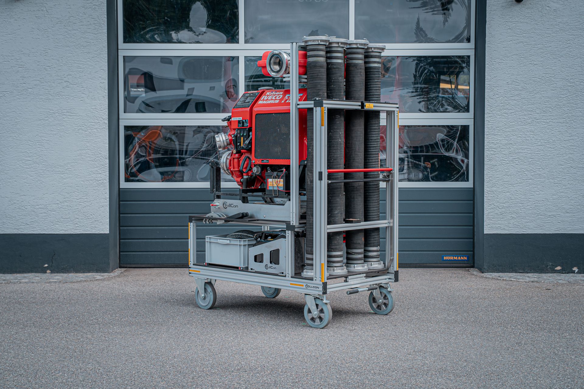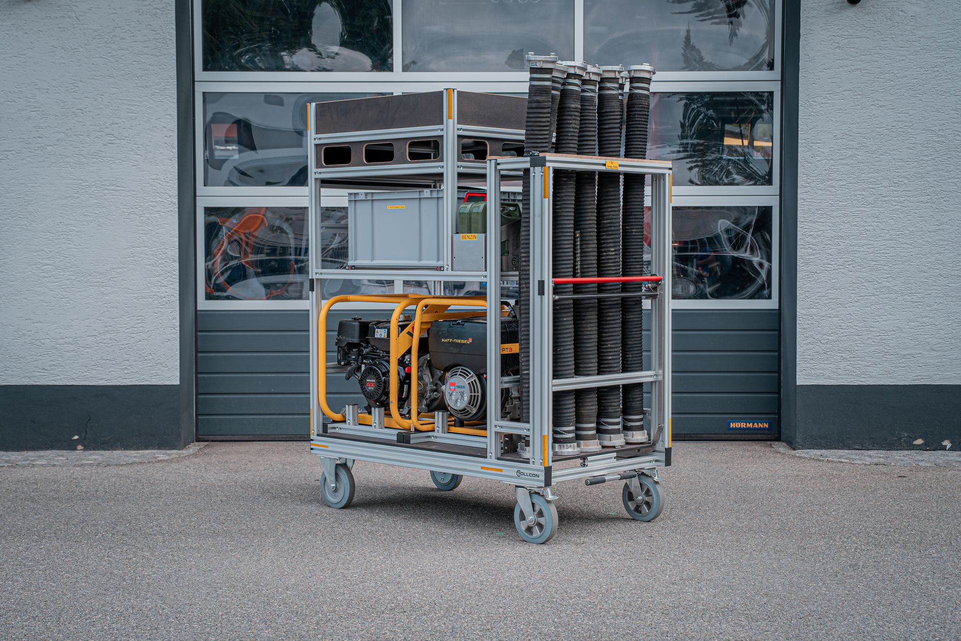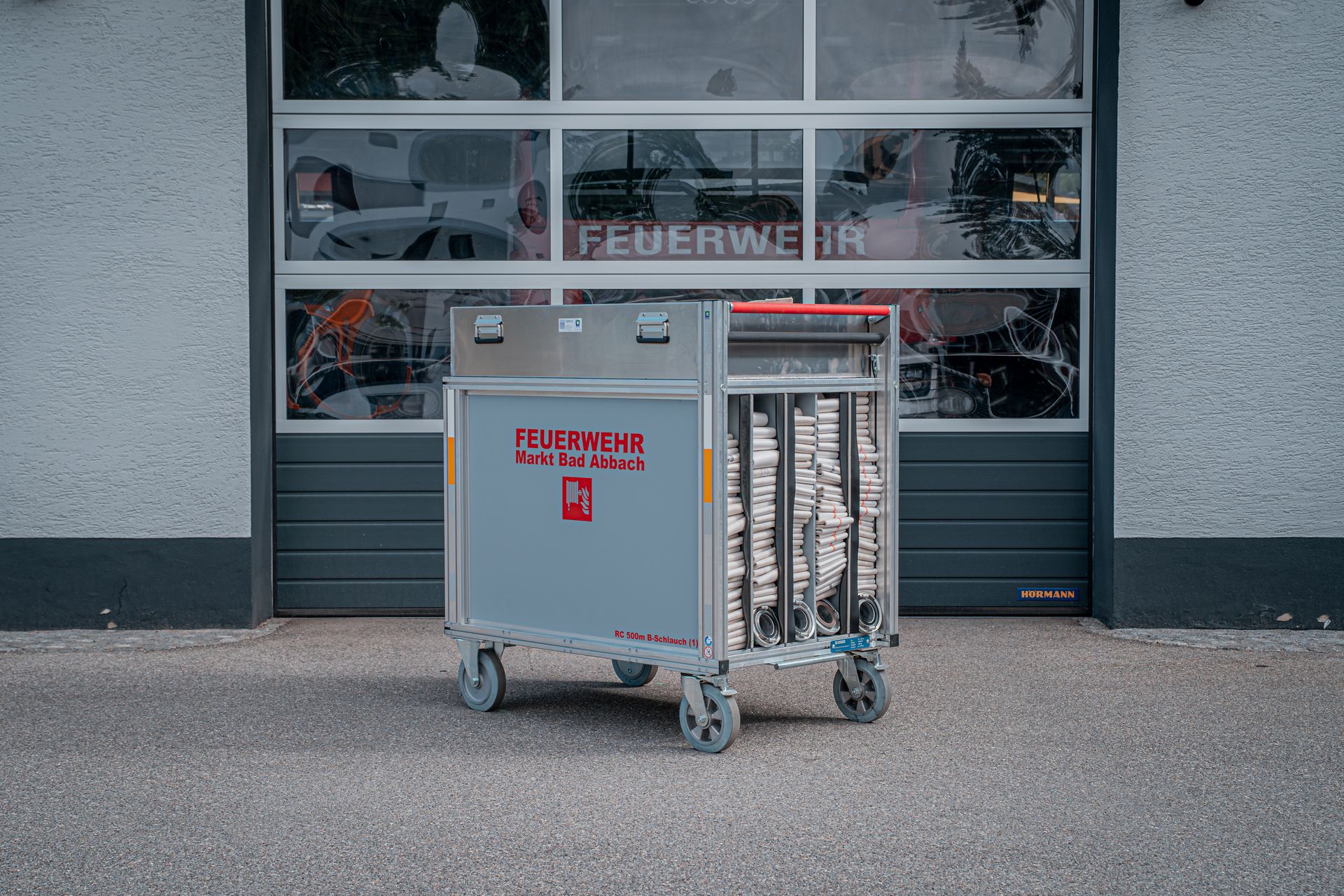 Mit den zwei am Standort befindlichen Rollcontainer Schlauch (á 500m B Druckschlauch) können lange Schlauchstrecken wie zum Beispiel Straßentunnel, abschüssige Objekte oder Wald und Wiesenwege verlegt werden. Im Einsatzfall können diese auf unseren V-LKW verlastet werden und so in Schrittgeschwindigkeit vom Fahrzeug aus verlegt werden. Zusätzlich führen diese Container Schlauchbrücken und einen Schlauchaufroller mit.