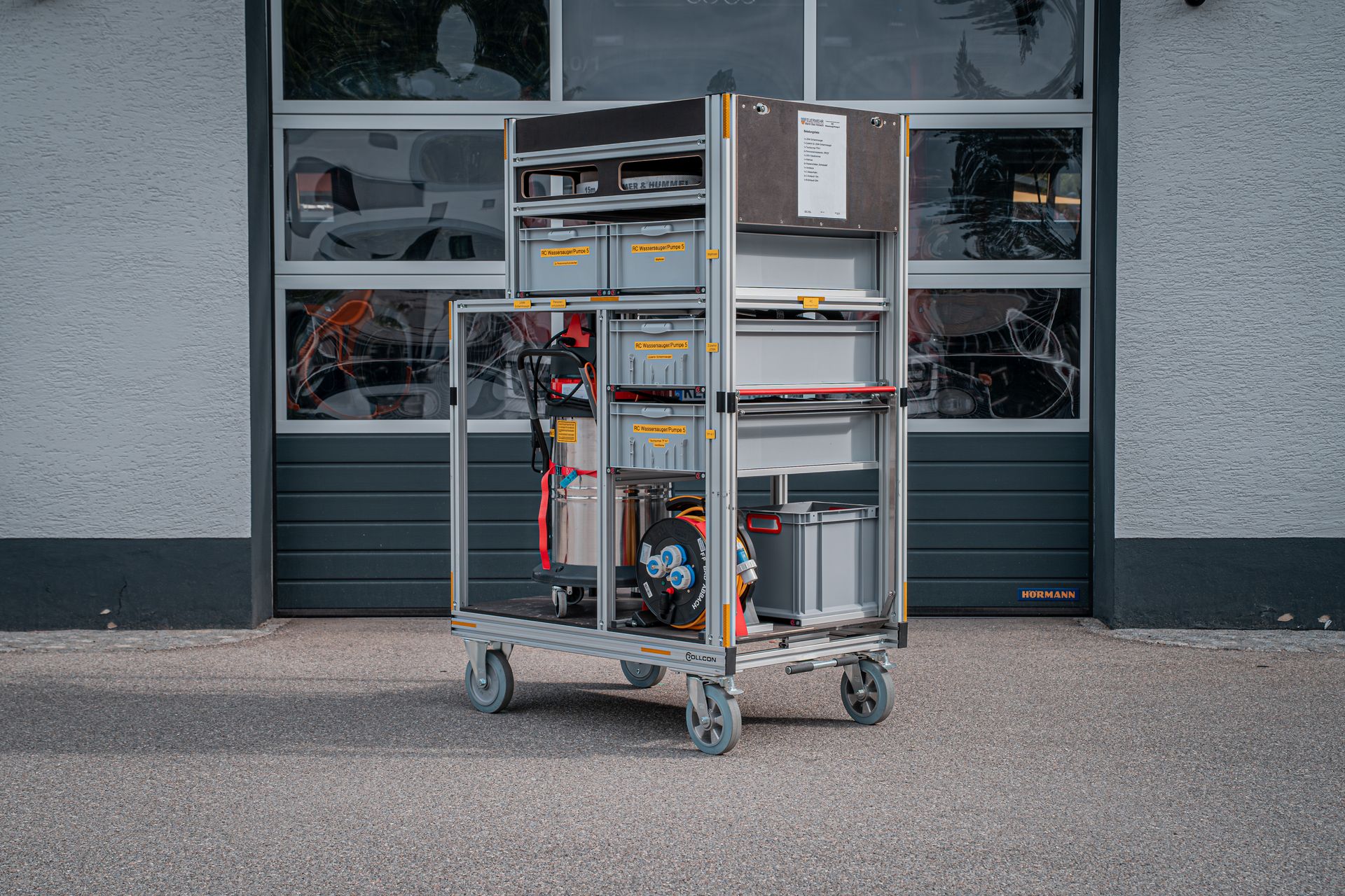 Eigens für unseren Straßentunnel wurde im Jahr 2022 ein Rollcontainer Atemschutz angeschafft. Bei einem Brandfall rüsten sich Atemschutzträger mit den vier Langzeit Pressluftatmern aus und führen diesen anschließend mit in die Röhre. Neben einem 45m C-Schlauch befinden sich weitere Hilfmsittel, Armaturen und Werkzeuge auf diesem Container.