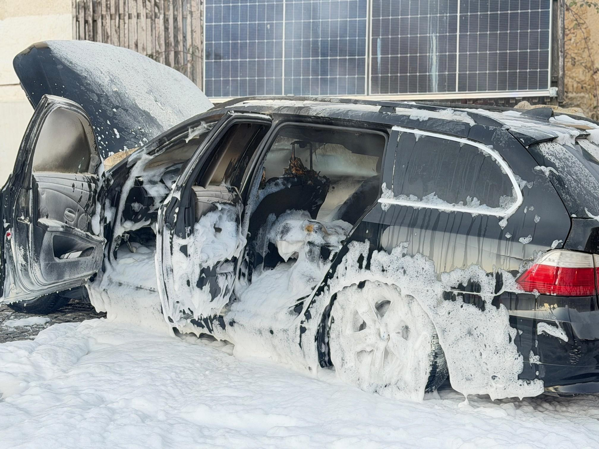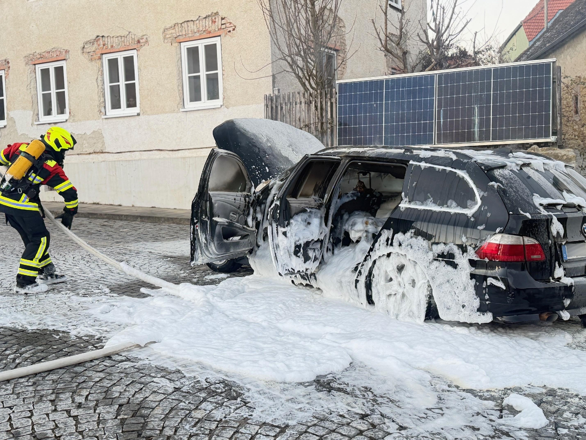 Ein Führungsdienstgrad fuhr daraufhin mit an. Ein Trupp unter Atemschutz löschte das in Vollbrand stehende Fahrzeug der Marke BMW innerhalb weniger Minuten mittels einem Schaumrohr ab.