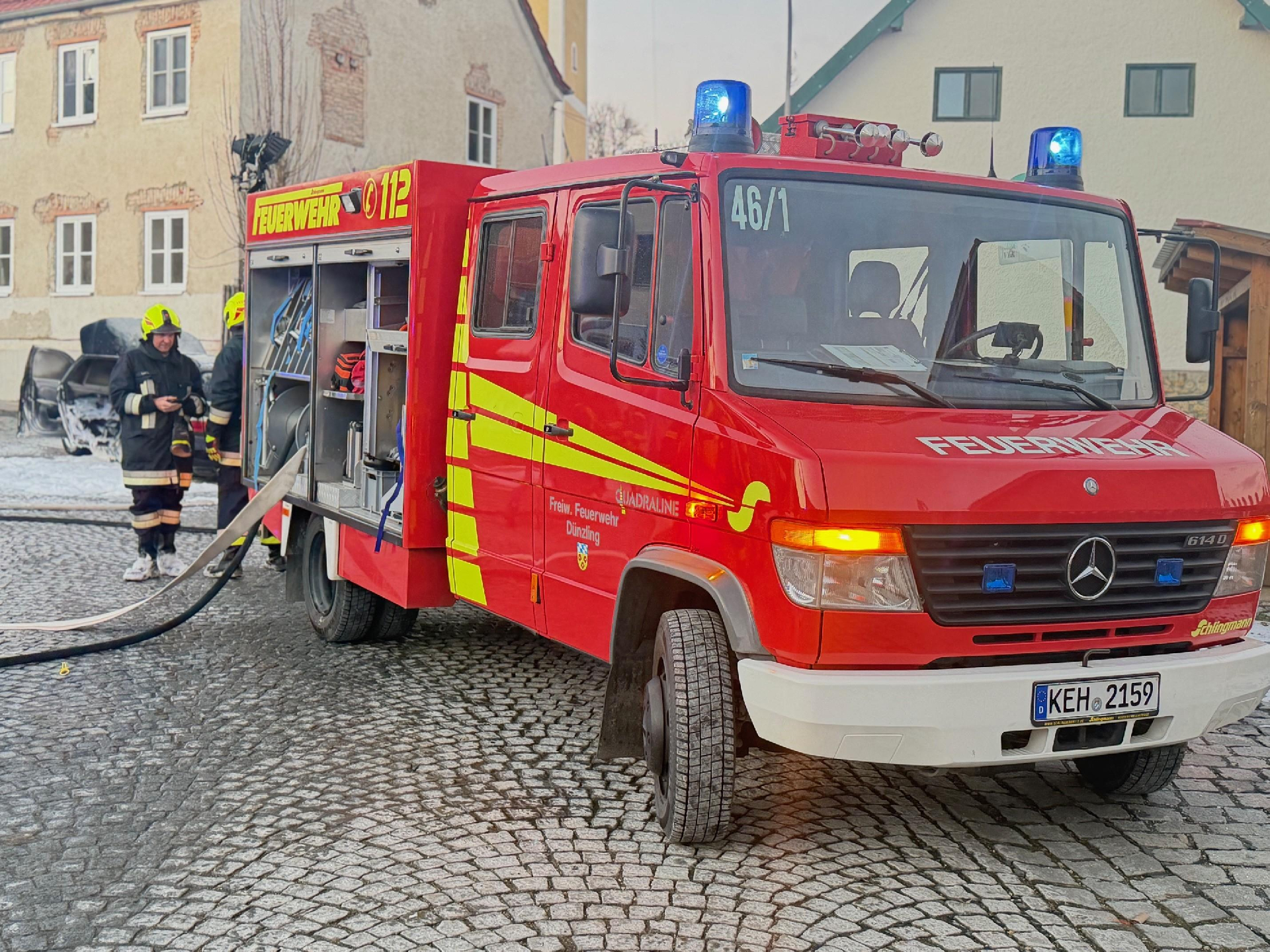Um 16:14 Uhr wurde die Ortsteilwehr Dünzling zusammen mit der Feuerwehr Thalmassing zu einem brennenden Pkw in die Saalhaupterstraße alarmiert.