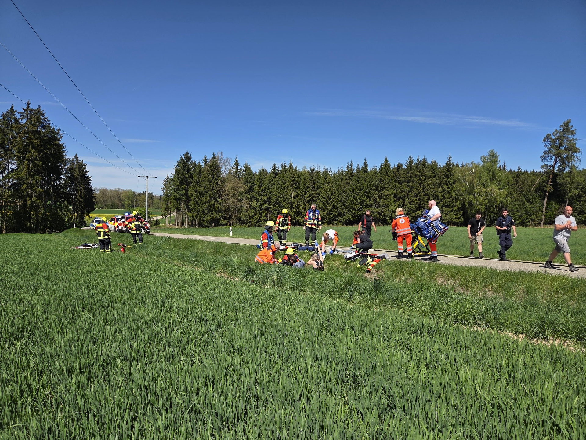 Ein alleinbeteiligter Motorradfahrer kam von der Fahrbahn ab und landete schwerverletzt im angrenzenden Straßengraben. Feuerwehrsanitäter übernahmen bis zum Eintreffen des mitalarmierten Rettungsdienstes die Erstversorgung.