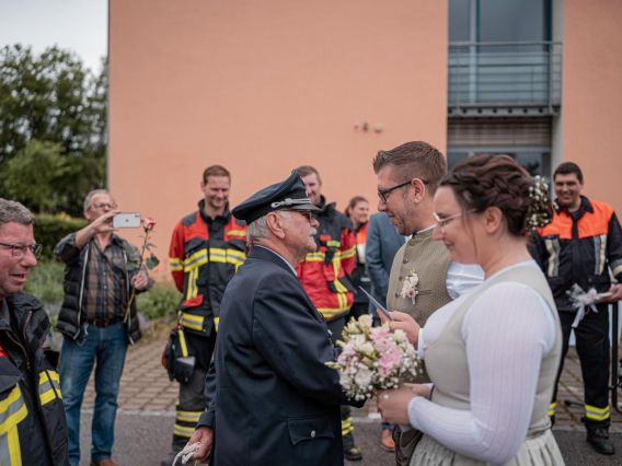 Es war ein wunderschöner Tag voller Freude, Lachen und unvergesslicher Momente. Ein Spalier, bestehend aus Angehörigen, Freunden, Kollegen, Kameraden der Ortsteilwehren und unserer Wehr, begrüßte das frisch vermählte Paar vor dem Rathaus in Bad Abbach. Wir sind so stolz, Teil dieses besonderen Moments gewesen zu sein, und wünschen dem frisch vermählten Paar alles erdenklich Gute für ihre gemeinsame Zukunft.