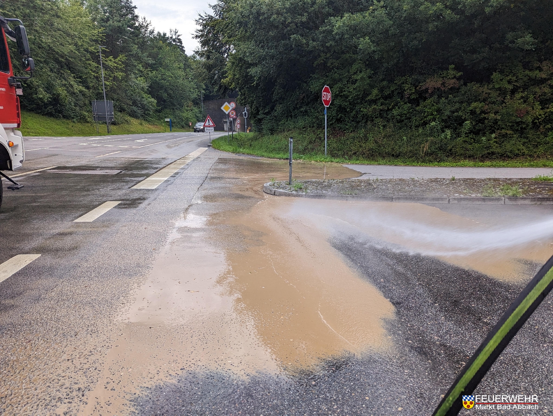 Ausgehend von einem Acker, überflutete ein Starkregenereignis die Stinkelbrunnstraße im Kreuzungsbereich am Tunnelportal mit Schlamm und Geröll. Die Fahrbahn wurde gereinigt.