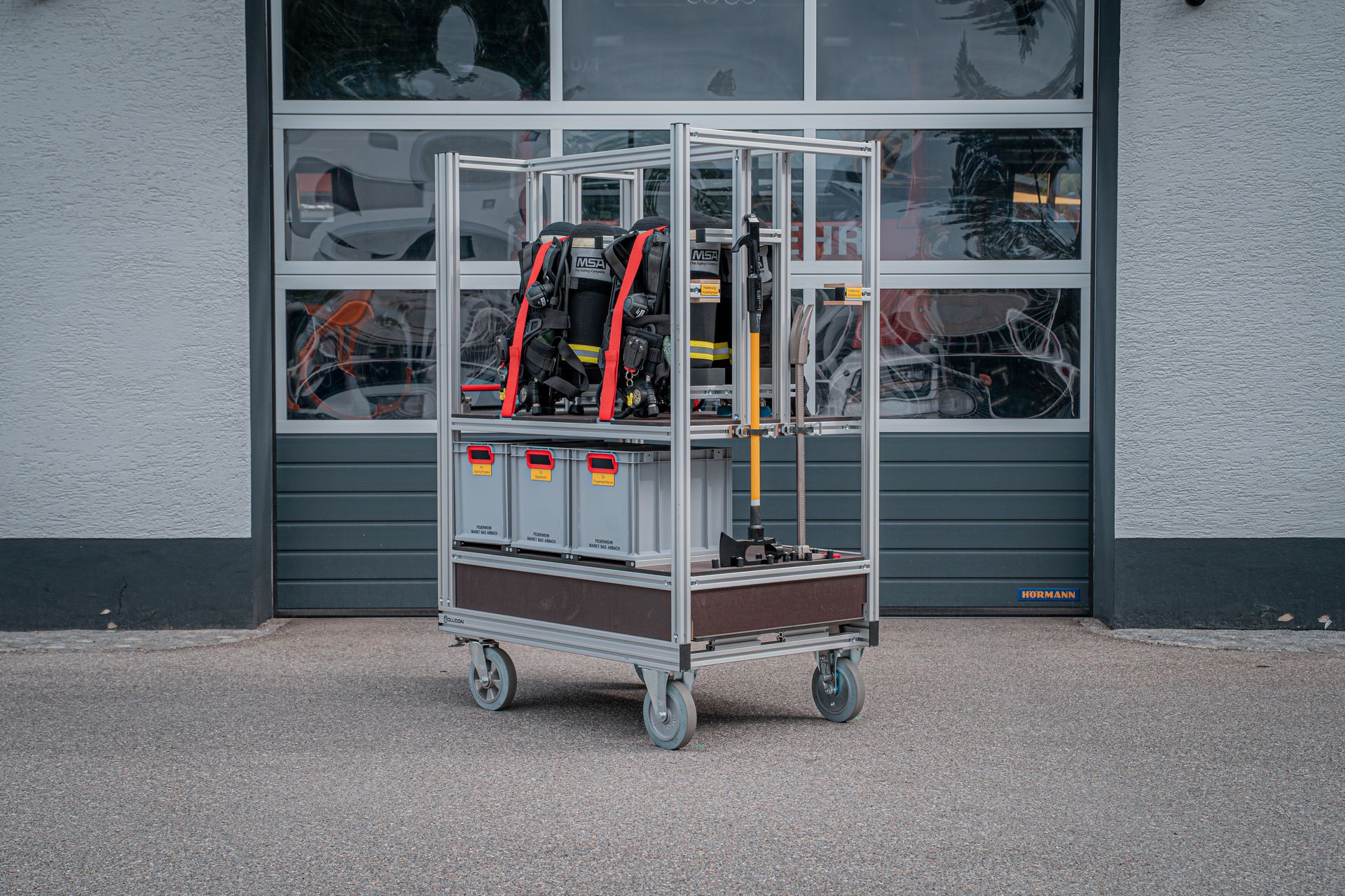 Eigens für unseren Straßentunnel wurde im Jahr 2022 ein Rollcontainer Atemschutz angeschafft. Bei einem Brandfall rüsten sich Atemschutzträger mit den vier Langzeit Pressluftatmern aus und führen diesen anschließend mit in die Röhre. Neben einem 45m C-Schlauch befinden sich weitere Hilfmsittel, Armaturen und Werkzeuge auf diesem Container.