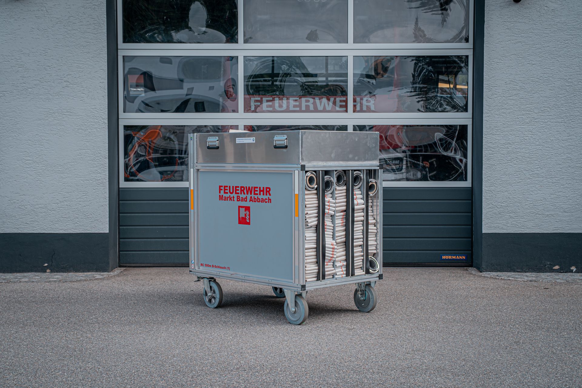 Mit den zwei am Standort befindlichen Rollcontainer Schlauch (á 500m B Druckschlauch) können lange Schlauchstrecken wie zum Beispiel Straßentunnel, abschüssige Objekte oder Wald und Wiesenwege verlegt werden. Im Einsatzfall können diese auf unseren V-LKW verlastet werden und so in Schrittgeschwindigkeit vom Fahrzeug aus verlegt werden. Zusätzlich führen diese Container Schlauchbrücken und einen Schlauchaufroller mit.